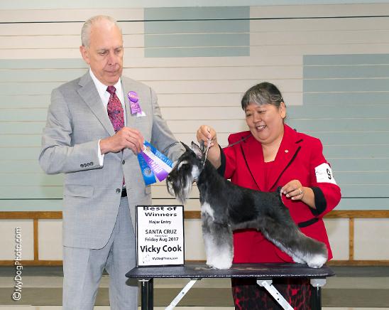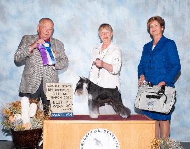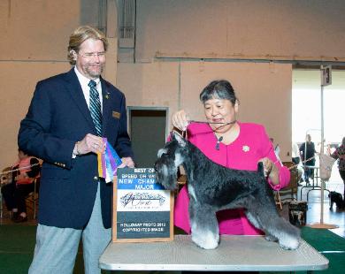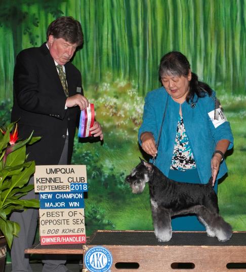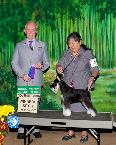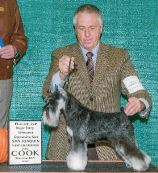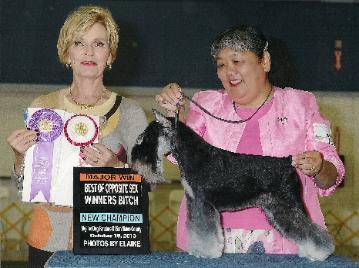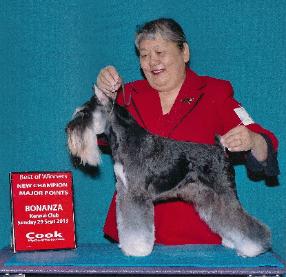 GCH Bachi's Eclipse of the Moon "SELENE" Not to be outdone by her brother, Mars, SELENE finished with a three point major going Winners Bitch, Best of Winners and Best Opposite Sex at Costa Mesa, California a month later. SELENE is the first GRAND CHAMPION for Bachi's Miniature Schnauzers |